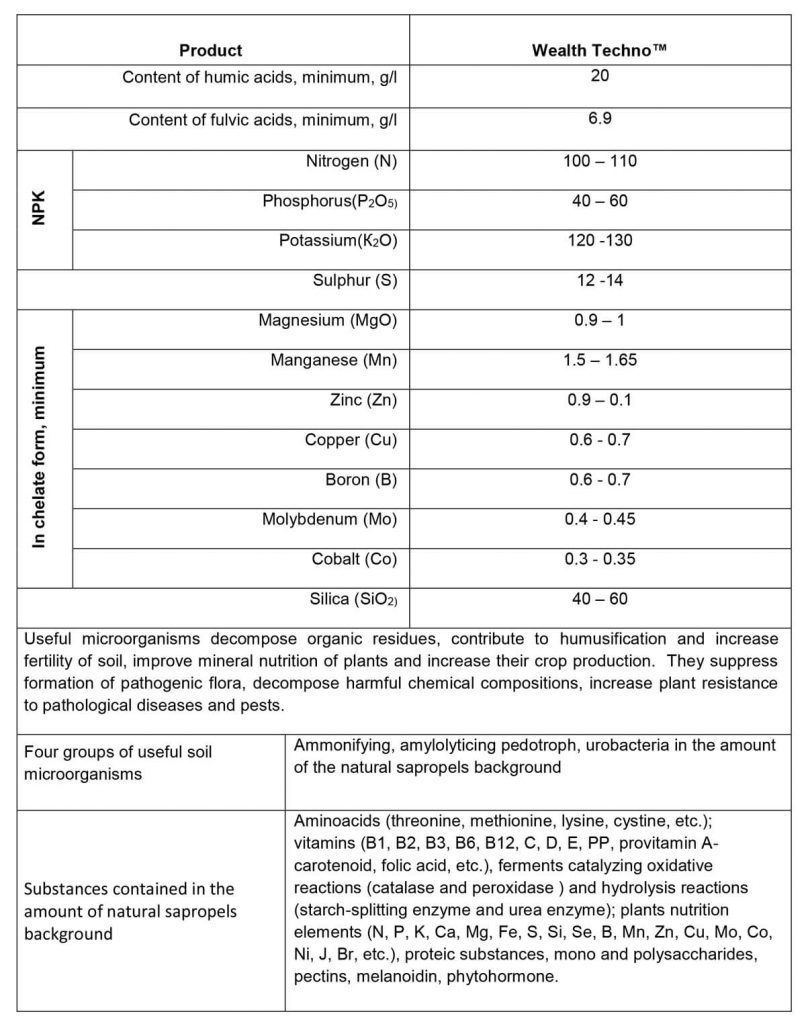 Wealth PGP is used for nourishing agriculture crops and plants both in enclosed and open soils. In agriculture production PGP “Wealth” brands are used to stimulate plant growth and development, to increase crop yield, to improve plant resistance to pathological diseases and pests, adverse climate conditions (droughts, ground frost, etc), to reduce harmful effects of pesticides on plants and soil (used in composed of one tank mixture), reduction (of 30% minimum) of mineral fertilizers distribution rate. Application of “wealth” leads to improvement of taste and nutritional value of products and an increase in their storage time. While tiling the soil using “wealth” IT is enriched with humates, useful soil bacteria, macro and microelements. The fertilizer is extremely economic (distribution rate for top dressing amounts to 200 ml/Acre) and increases crop production up to 50%-80%.