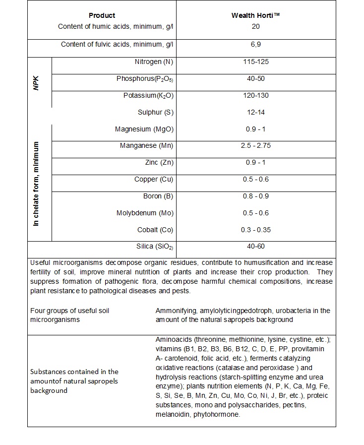 Wealth is a very active absorbent(functional group is COOH and OH in sum 550-800 milligram- equivalent of dry substances. Besides, Wealth has long-term effect, doesn’t wash out health-giving substances and creates conditions for appearing new ones.
